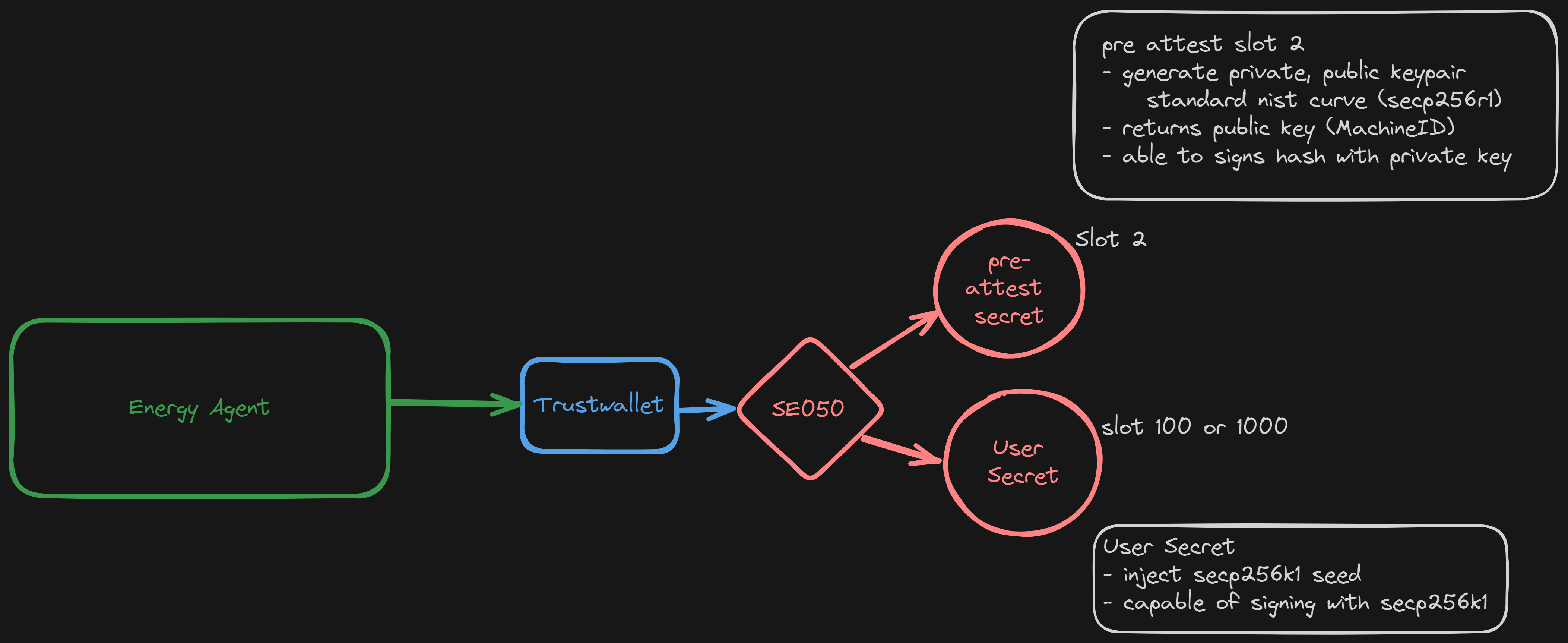 The Energy Agent comes with a Trust Wallet attached. The Trust Wallet manages the keys and is pre-provisioned with a machineID key that is attested to the RDDL Network. The attested machine ID enables the Energy Agent to register to the network and attest itself to start interacting with the network.